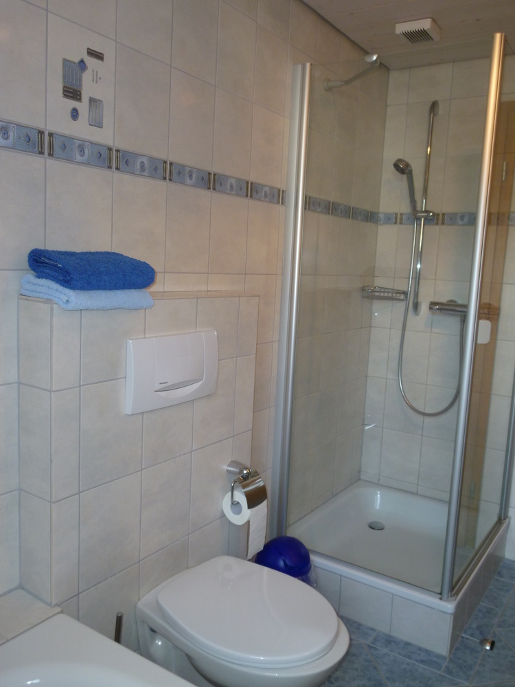 - modernes Tageslichtbad mit Dusche, Badewanne und WC, Fön