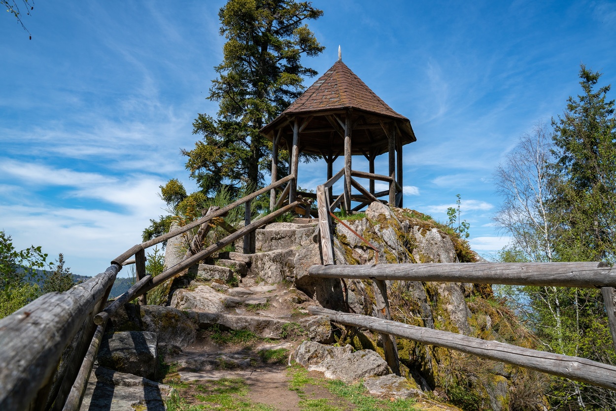 Der Ausblick vom Aussichtspavillon auf dem Felsvorsprung ist herausragend. Der Blick reicht hinunter ins Murgtal und sogar bis hin zur Rheinebene im Westen, er ist immer wieder eine Belohnung für den intensiven Aufstieg. Der Pavillon ist ein toller Rastplatz und ideal für eine kleine Pause.