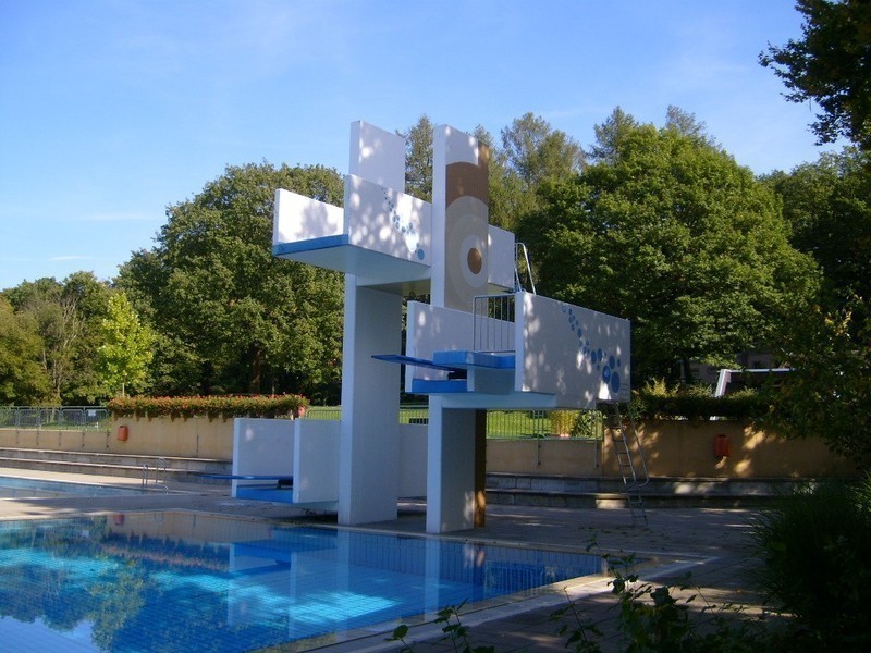 Das neu renovierte Bad verfügt über ein großes Nichtschwimmerbecken mit Breitwellenrutsche und Wasserpilz, ein separat gelegenes Kinderplanschbecken mit Wasserigel, Wasserkanone, Babyrutsche und Wasserspiel, ein Schwimmerbecken und ein Becken mit Sprunganlage.