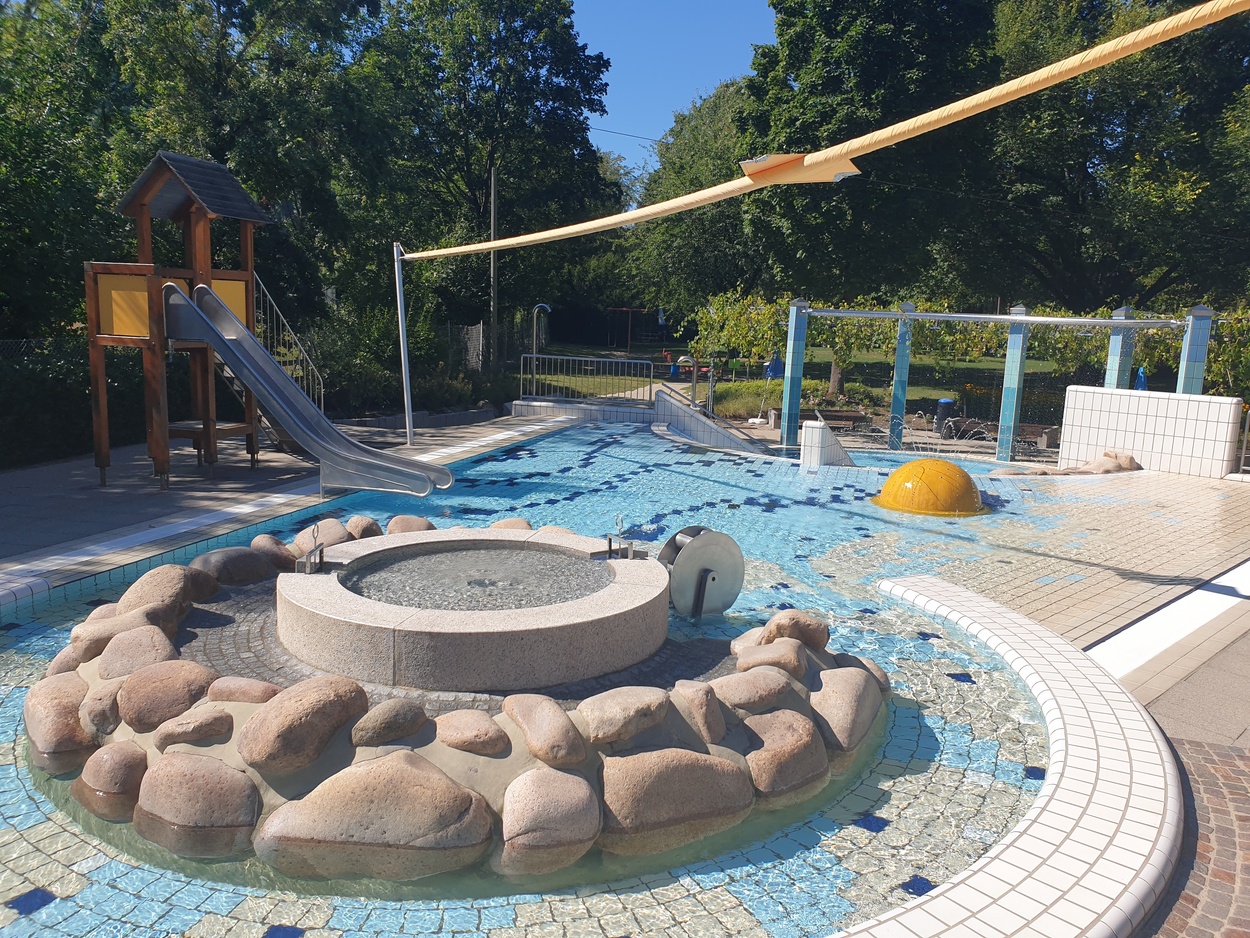 Für die Kleinen gibt es über dem Kinderbecken ein Sonnensegel, einen Kinderbereich mit Erlebniswelt, Strömungskanal, Kinderrutsche und einen Matschplatz.